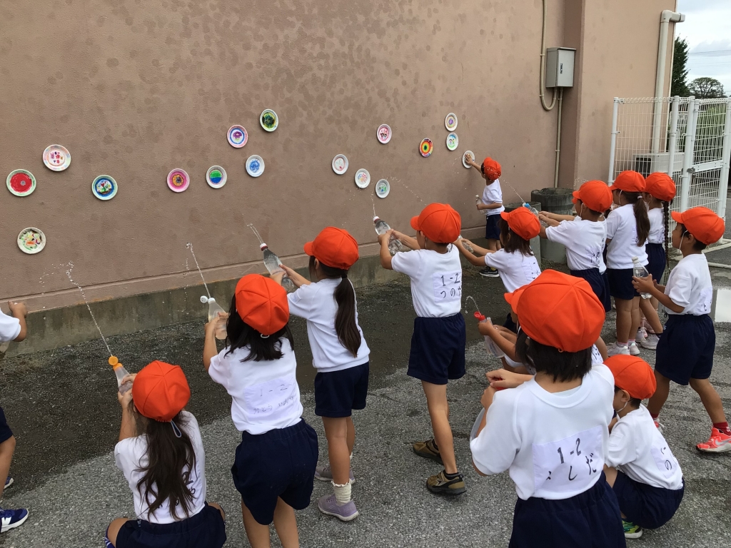 紙皿に自分の好きな絵をクレヨンで描いて的を作り、みずでっぽうであてました。