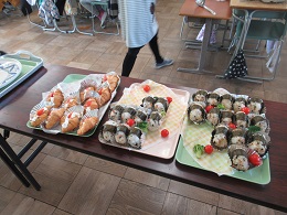 卒業のお祝いとして、バイキング給食を行いました。この日は6年1組の日でした。おにぎり、クロワッサンのクリームサンド、ピザ、ホットドッグ、唐揚げ、フルーツにケーキ等、さまざまなメニューの中から子供たちは食べたいものを選び楽しんでいました。