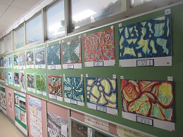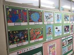 先月行われた児童生徒美術展に出品した作品を職員室前に展示しました。