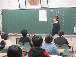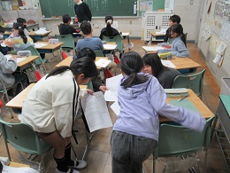 「文字の大きさと配列に気を付けて書こう」という課題の下、年賀状の書き方について学びました。3つの例を見比べてポイントを押さえた上で一度書いてみてふり返りをする。書いたものを隣の席の子、班の子に見せてアドバイスをし合う。そして最後にもう一度書く。子供たちは自分の書いたものをよく見て、ポイントを意識しながら真剣に取り組んでいました。