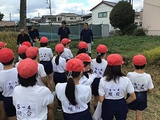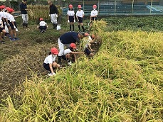 本日稲刈りを行いました。JAの方々に田植えからご協力いただき、無事にこの日を迎えることができました。児童たちは、自分たちの育てた稲が大きく育ったことや稲を刈る感触に歓声を上げてました。刈り取ったお米は一度干して、その後JAの方が精米をしてくださり、児童のもとに届く予定です。最後まで楽しみですね!