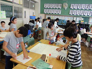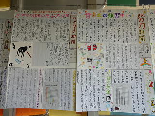 学級の出来事や他の授業で調べたことなど、グループで書きたい記事を話し合いました。